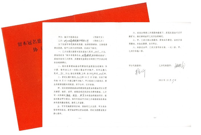当天会场还举行了企业留本冠名基金签约仪式。我公司大力支持慈善事业,自愿认捐留本冠名基金1000万元,其增值收益资金全部用于桐乡市慈善事业,助困、助医、助学、助孤老残及突发性灾难救助。“行有道,爱无界”,乐竞体育愿与市慈善总会一同努力,在扶贫助困、促进和谐社会建设中作出更大贡献。